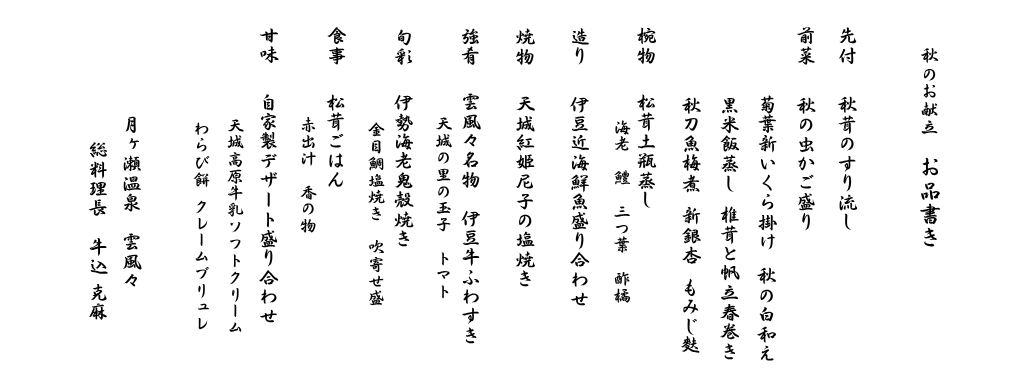 駿河湾・相模湾などの選りすぐりの鮮魚、 伊豆でも希少な大仁ひらい牧場の伊豆牛、天城の里の新鮮な生みたて卵、 目の前に流れる狩野川の恵み「鮎・あまご」、 野菜は自家菜園の手作り野菜を季節毎に育てております。 料理長が自ら足を運んで選んだ伊豆の厳選食材をふんだんに使用した 伊豆ならではのコース料理を、 River View Diningでお召し上がりください。