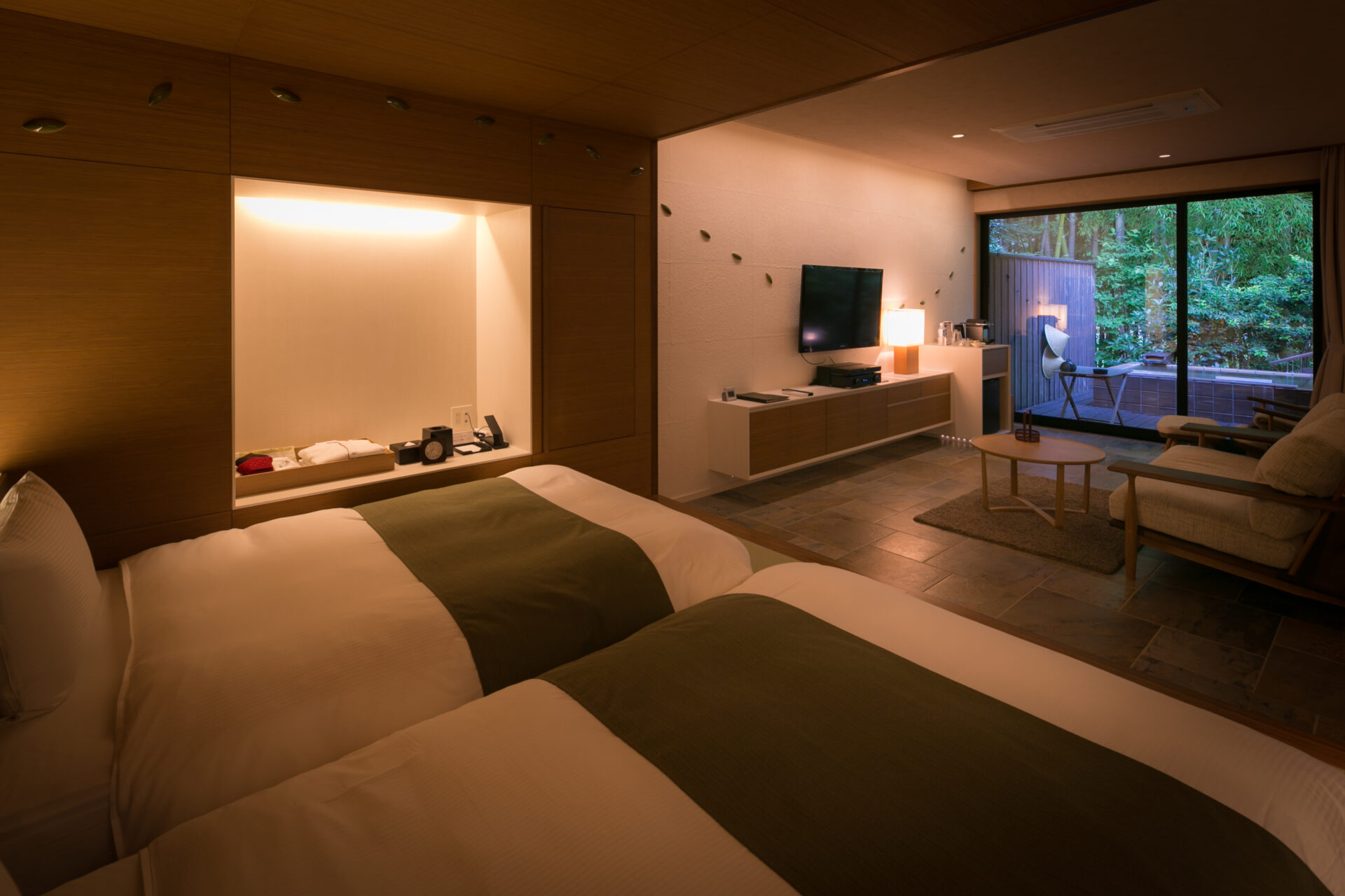 | 設備 | 内風呂、テレビ、衛星放送、電話、冷蔵庫、湯沸かしポット、お茶セット、ネスプレッソマシン、トイレ、ドライヤー(KINUJO)、ヘアアイロン(KINUJO)、DVDプレイヤー、加湿器付空気清浄機 ナノケア |